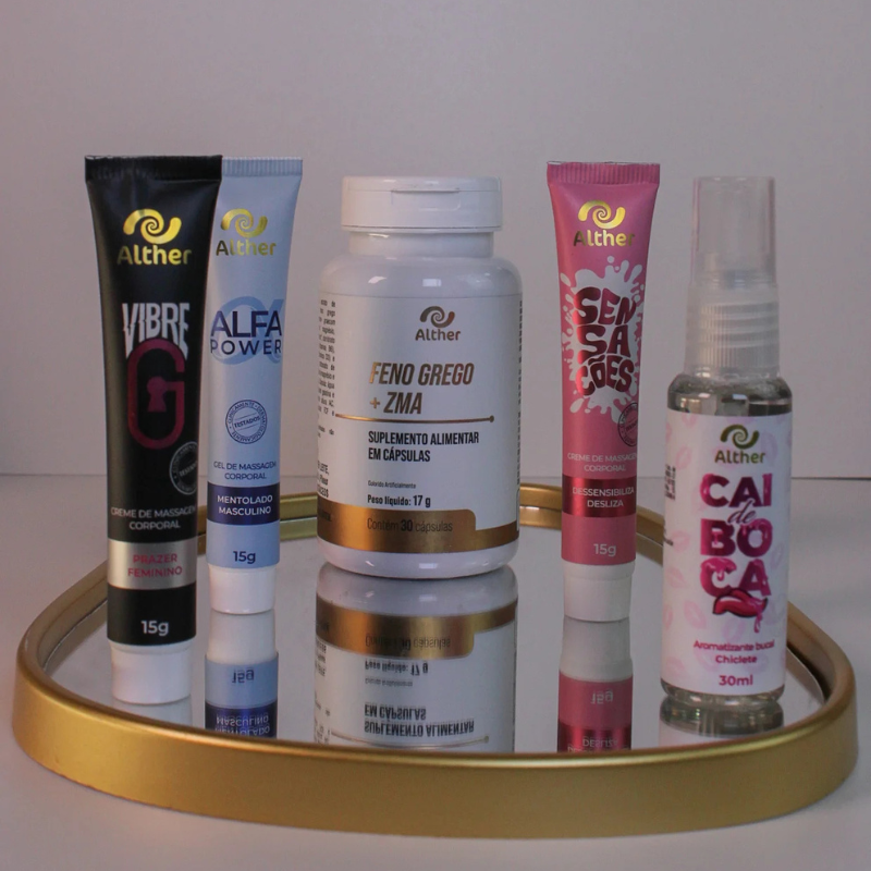 Com suplementação interna (Feno Grego), estímulos sensoriais (Vibre G e Sensações), performance (Alfa Power) e intensificação dos beijos (Cai de Boca), este kit combina tecnologia cosmética e nutrição masculina para entregar uma experiência poderosa — física e sensorial.